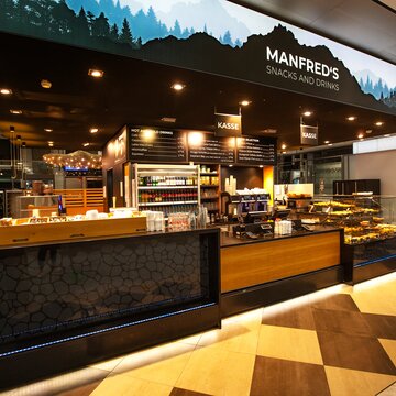 Schwäbische Klassiker erwarten dich bei Manfred’s: Ofenfrische Brezeln, Maultaschen mit Kartoffelsalat, knackige Laugenecken und Fleischküchle im Brötchen. Perfekt, um vor dem Abflug noch einmal regional zu genießen.